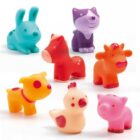 7 animaux de la ferme en plastique souple et colorés pour jouer et s’amuser à inventer de belles histoires, dès 18 mois.